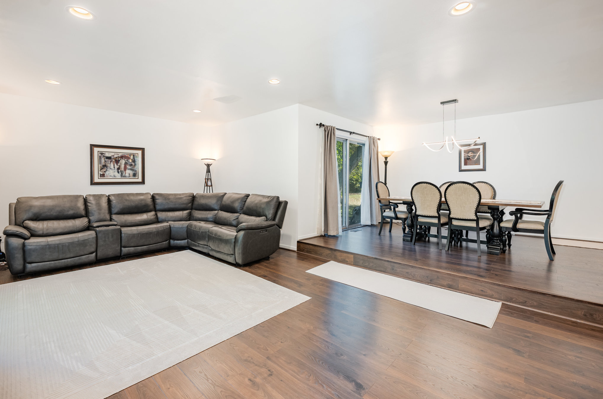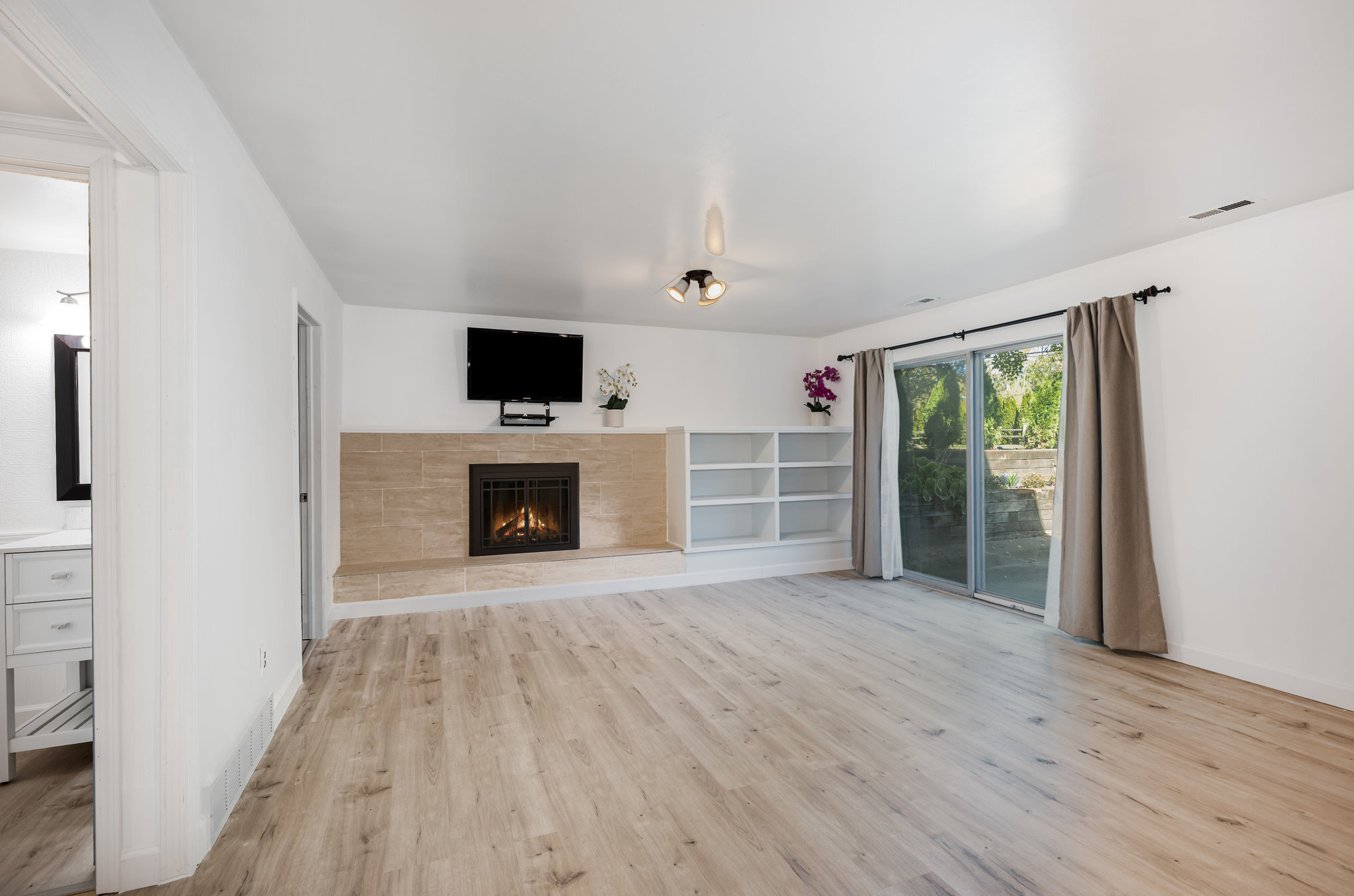 The lower-level features a family room with a lovely fireplace with custom surrounding built-ins, a half bath, a flex room that can double as an office, and brand-new, durable luxury vinyl flooring. The entry and lower levels also feature several doorwalls to the patios and private treed backyard.