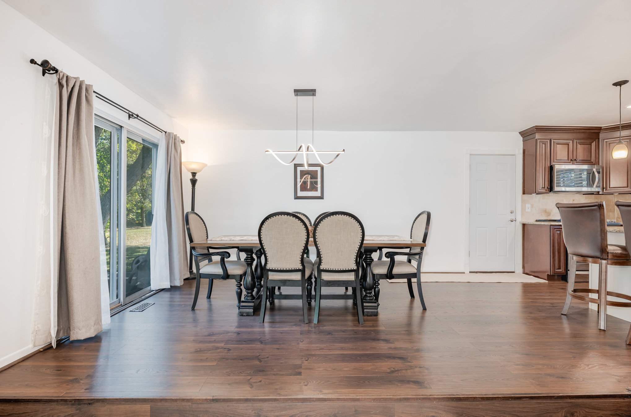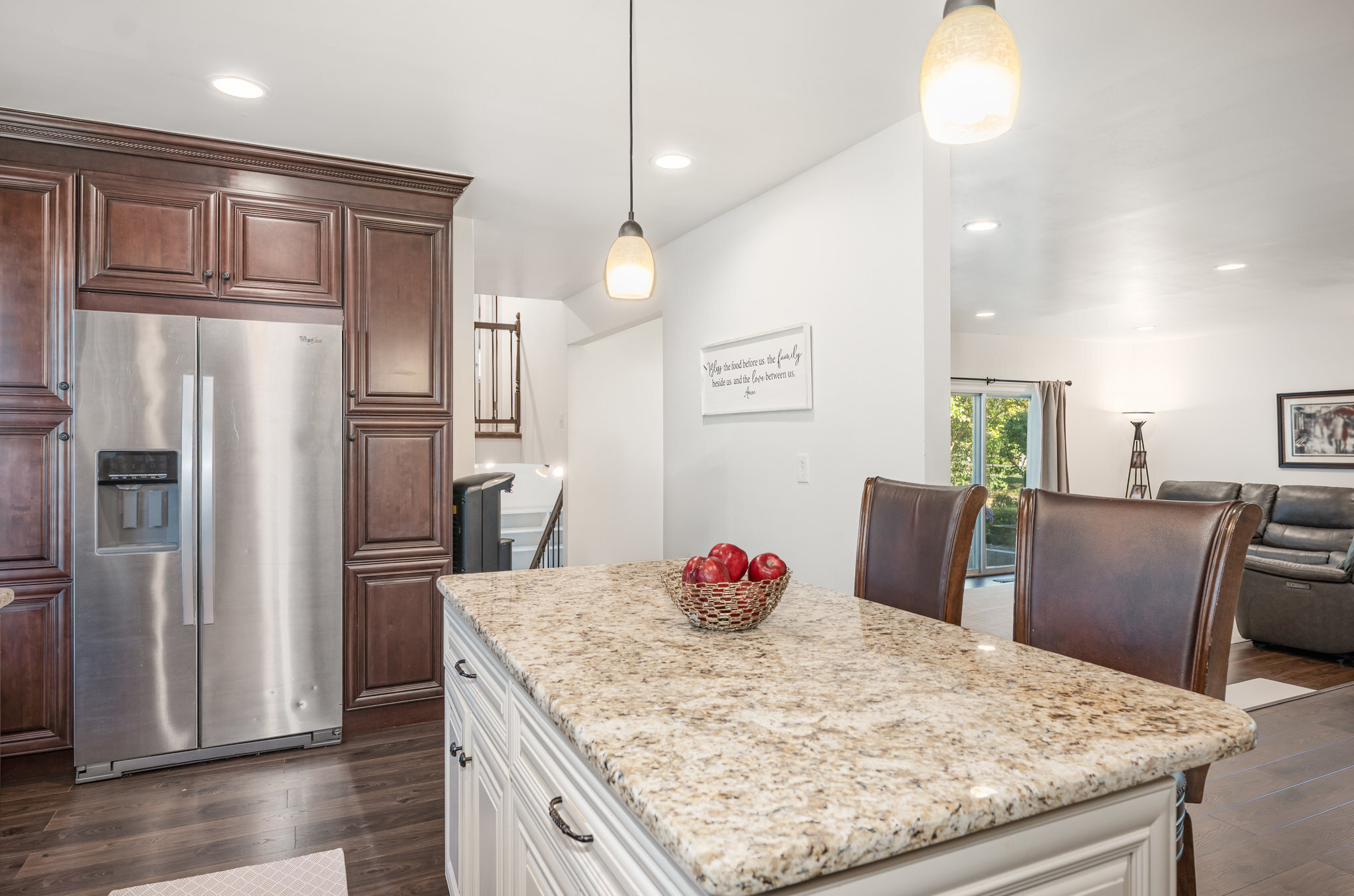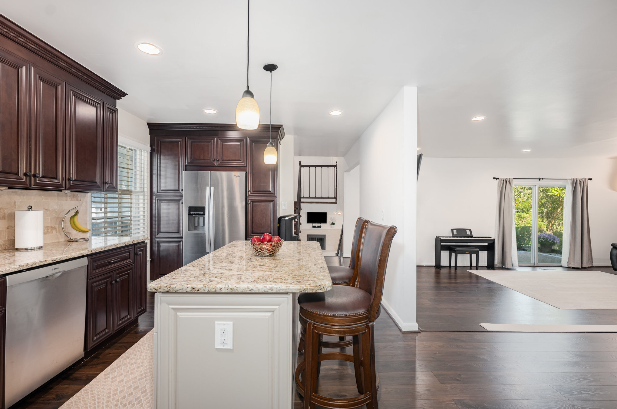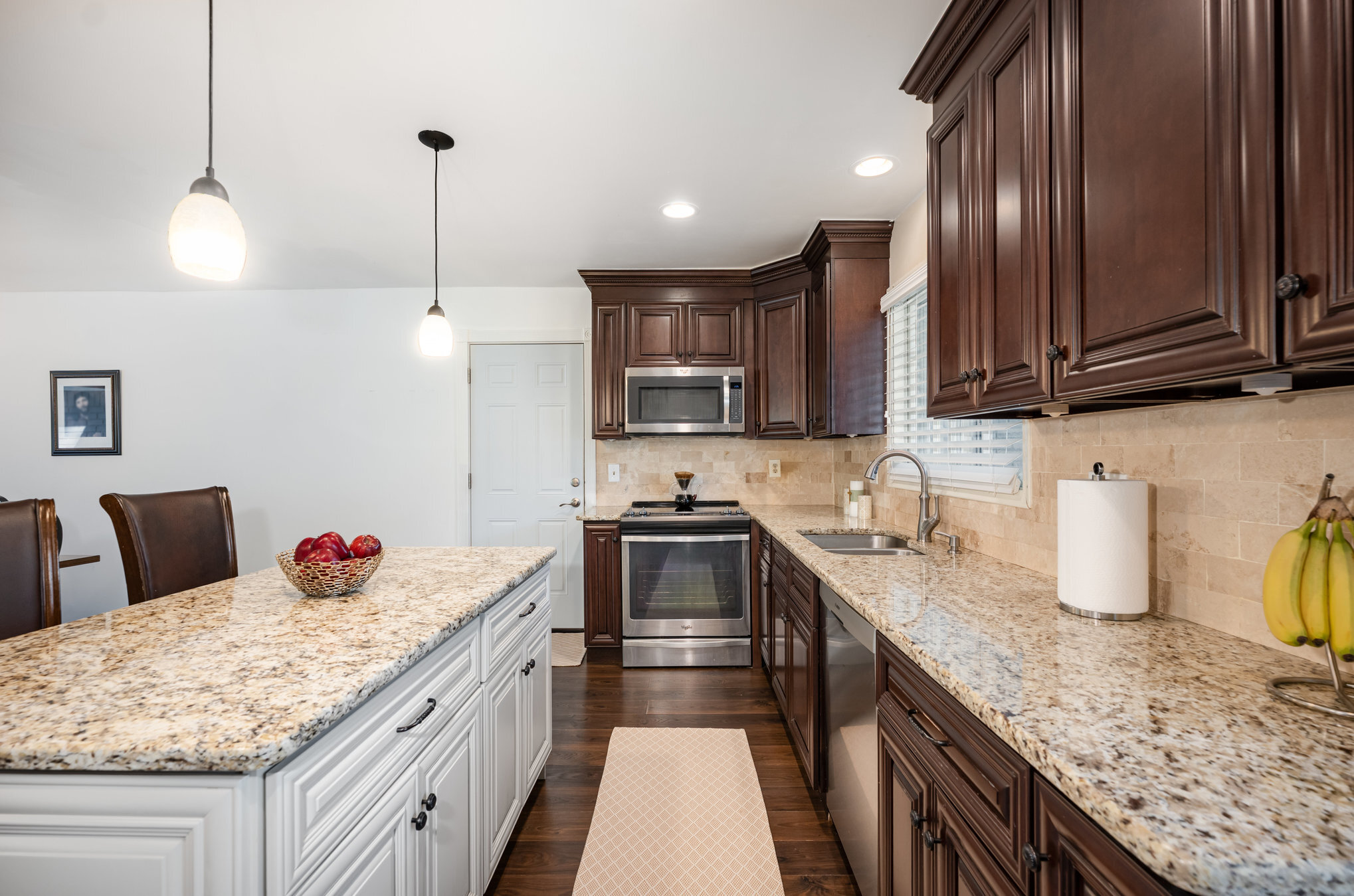 Fresh interior paint throughout makes the entire home feel crisp and inviting. The entry level has been redesigned with a wall removed to create a desirable open floor plan between the spacious living and dining rooms. The updated kitchen is a standout with granite counters, an island with bar seating, modern wood cabinetry, and stainless steel appliances.