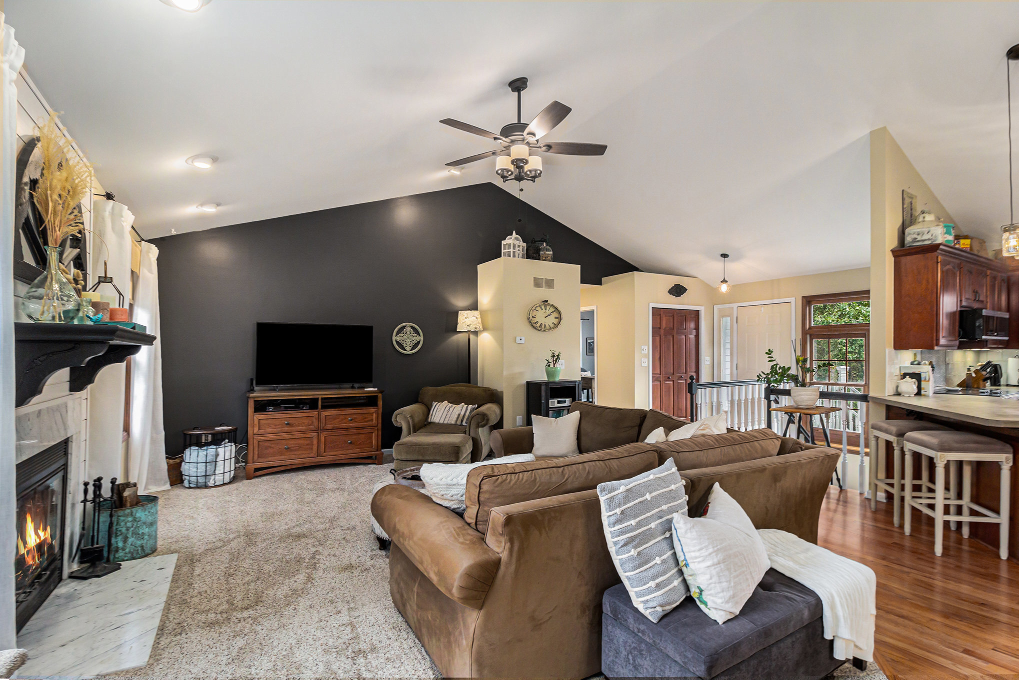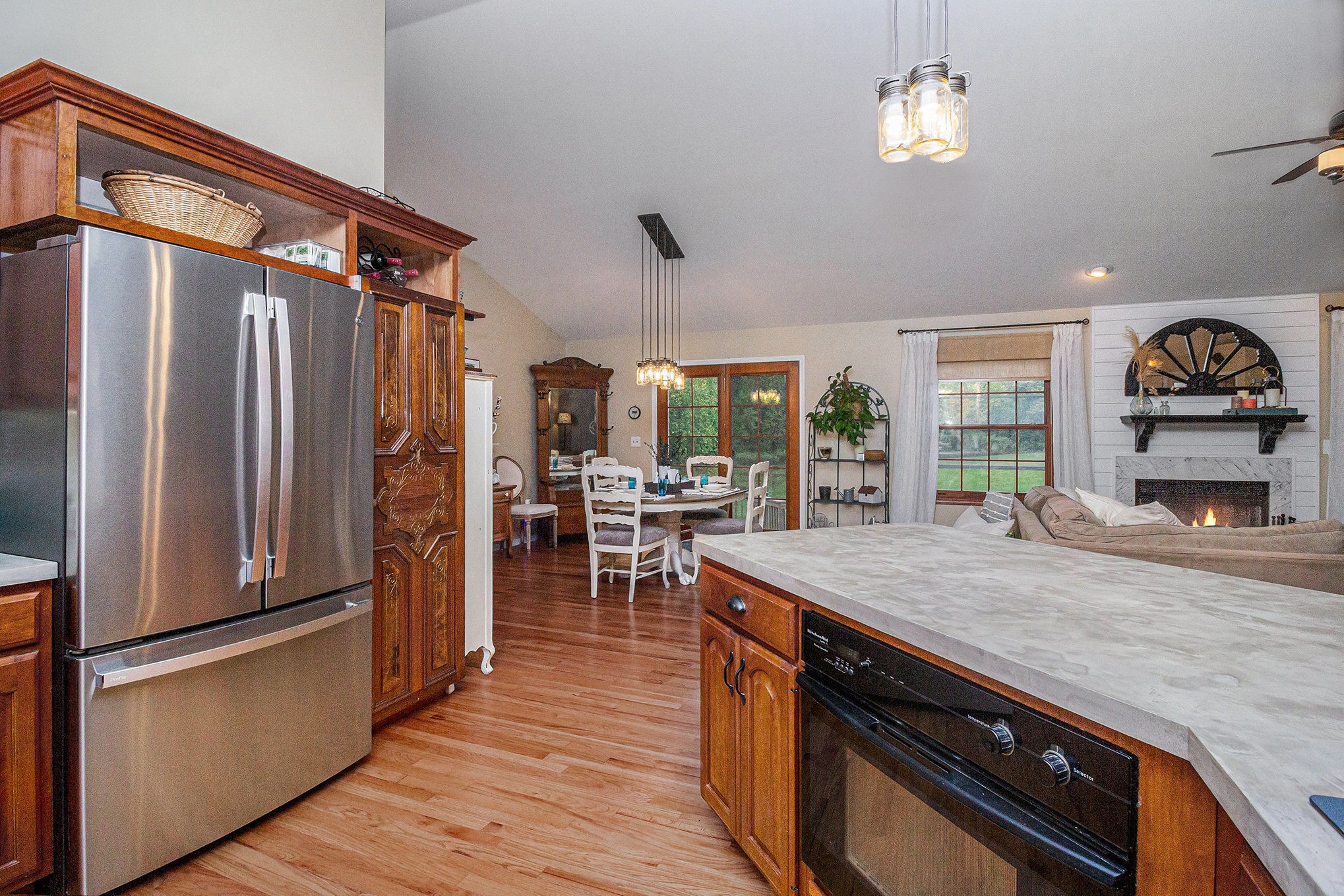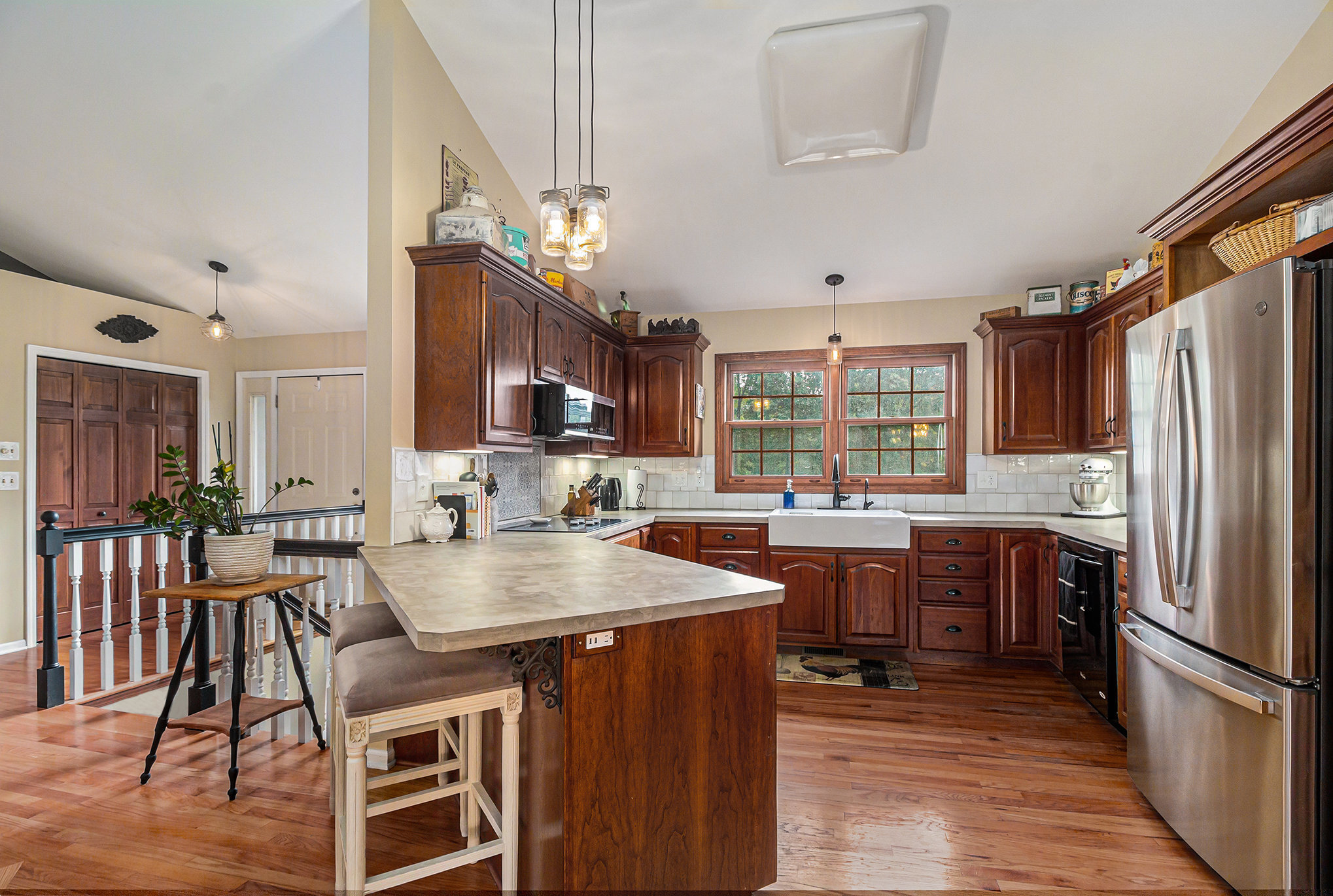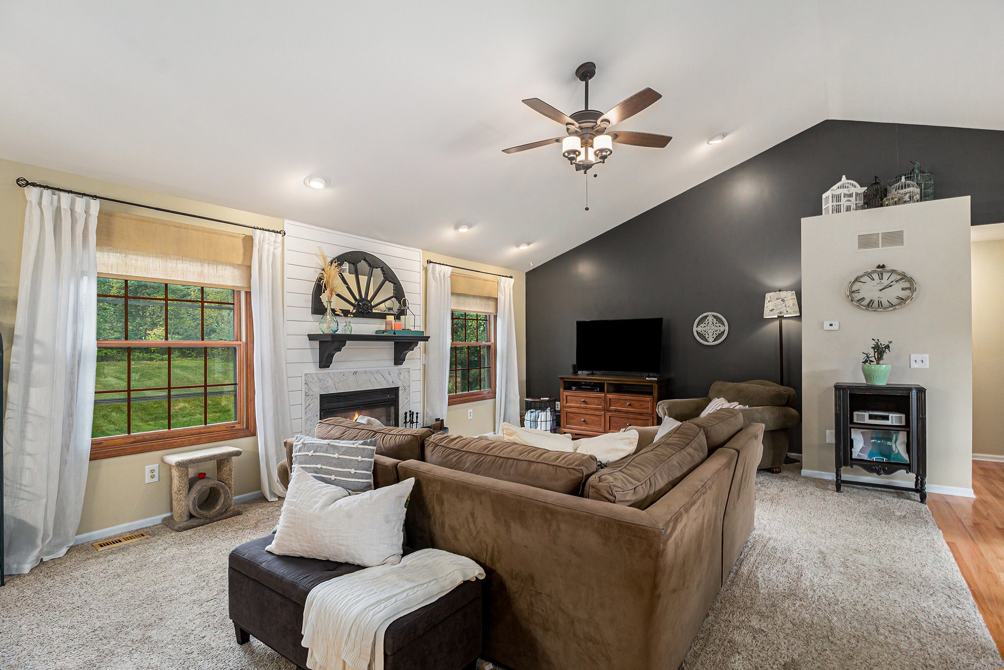 An inviting entry leads to a spacious open layout. The spacious great room features cathedral ceilings, a cozy fireplace for cozy winter days, and stunning year-round views of the grounds. The kitchen is completely open to the great room, has an abundance of cabinets and counter space, bar seating, newer stainless steel appliances, and a chic farmhouse sink. Just steps from a generous dining area with room to gather around a large table. The doorway leads to a freshly stained large deck expanding the outdoor living area.