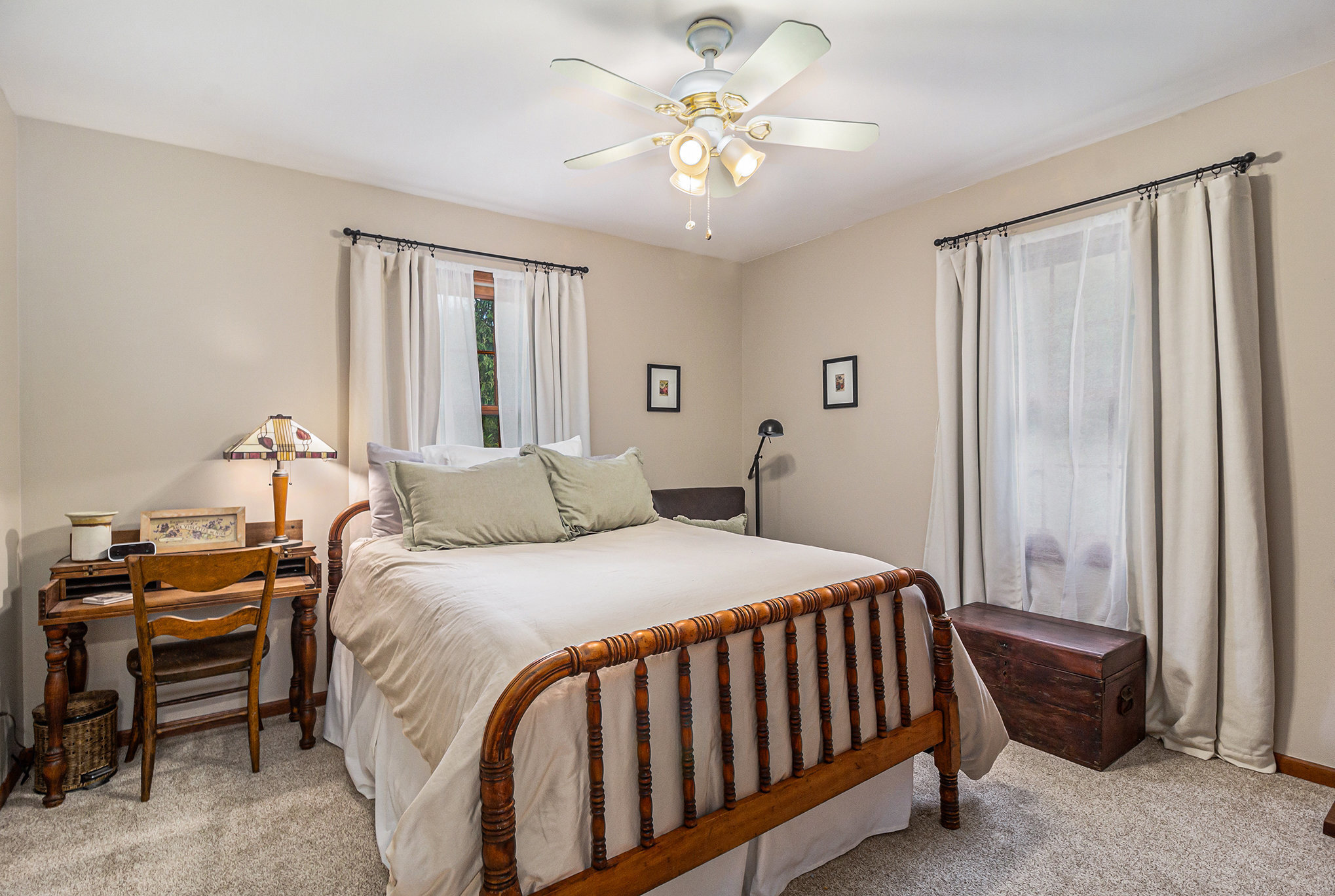 The primary suite is a quiet respite on one end of the house overlooking the grounds, with a large private bath, a vanity/dressing area, and two ample closets. Two additional bedrooms are on the other end of the house perfectly situated for guests or an office, serviced by amply sized second full bath.